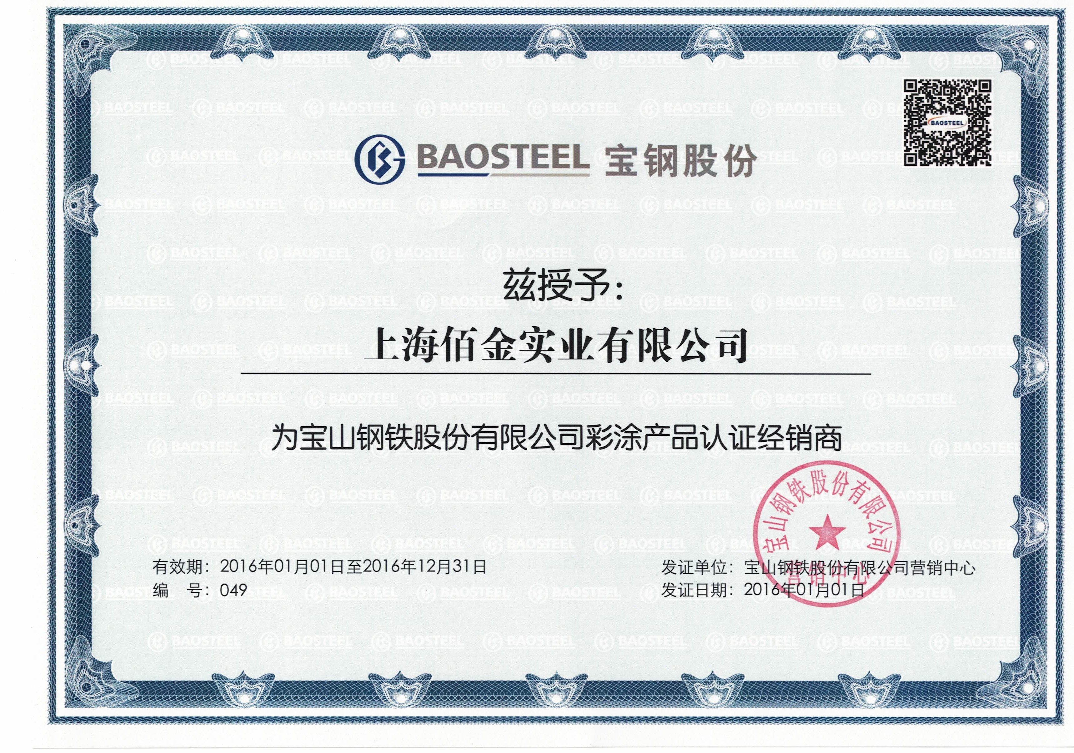 佰金華中銷售中心總公司上海佰金實業有限公司在幾年時間內,通過提供優質服務,先后獲得了與寶鋼與寶鋼黃石等大品牌合作的機會,獲取了他們的代理資格,代理證書如下: