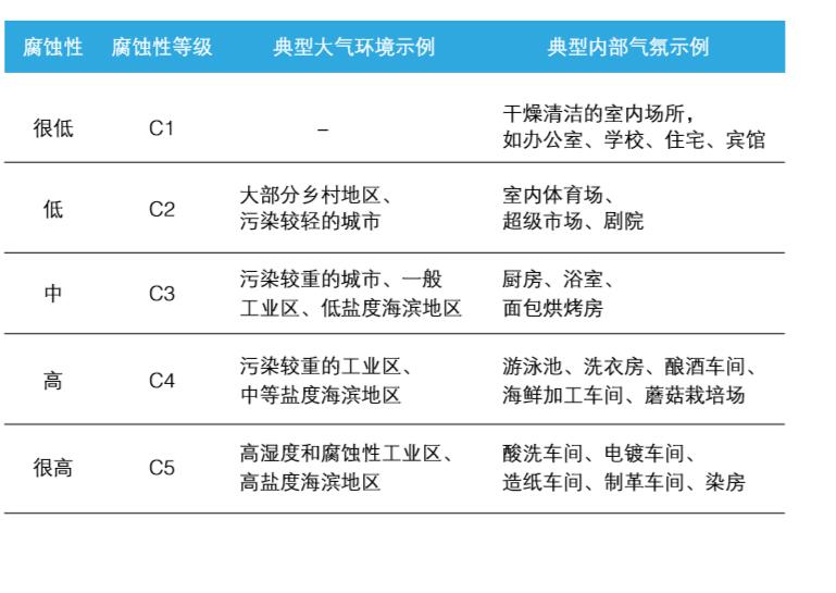 我國國家標準GB/T19292.1根據碳鋼、鋅、鋁等金屬第一年腐蝕速率測量值對大氣腐蝕性進行了分類,但是彩涂板還缺乏使用環境(指大氣環境和內部氣氛)腐蝕性分類的數據,僅定性的將大氣環境和內部氣氛腐蝕性分為5個等級即C1、C2、C3、C4、C5,其腐蝕性依次增強,表示給出了不同腐蝕性等級對應的典型大氣環境和內部氣氛。