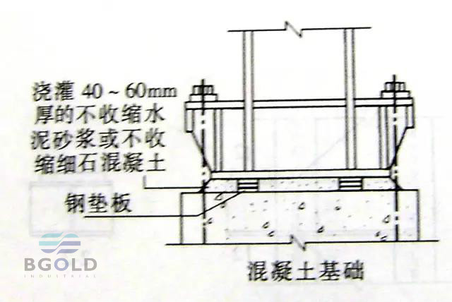 c.  墊板與基礎面應緊貼、平穩,其面積大小應根據基礎的抗壓強度和柱腳底板二次澆灌前柱底承受的荷載及地腳螺栓的緊固預拉力計算確定。